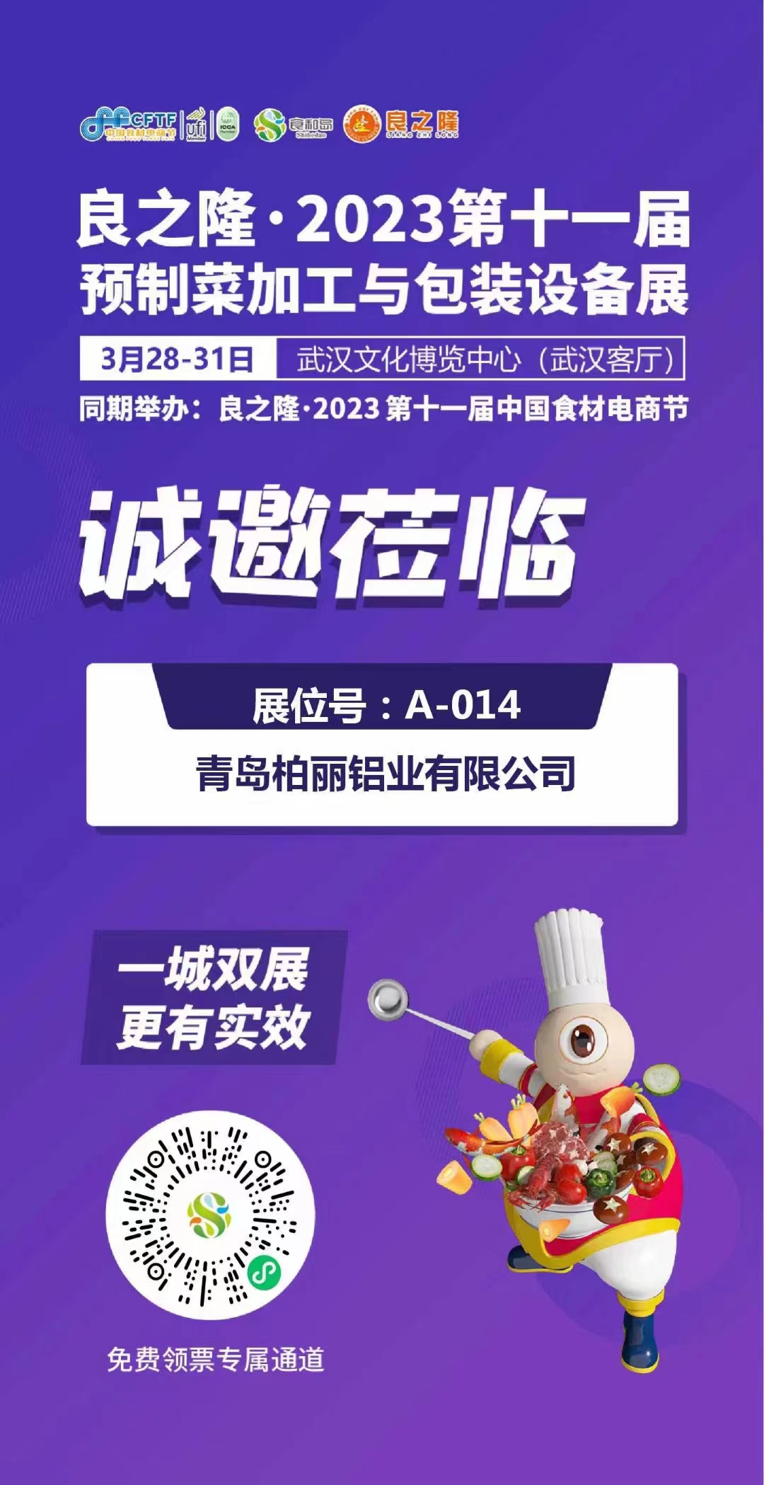 青岛柏丽铝业有限公司受邀参加2023年3月28—31日在武汉文化博览中心(武汉客厅)举办的良之隆·2023第十一届预制菜加工与包装设备展,我们诚邀各界人士和客户莅临青岛柏丽铝业有限公司展位参观指导。